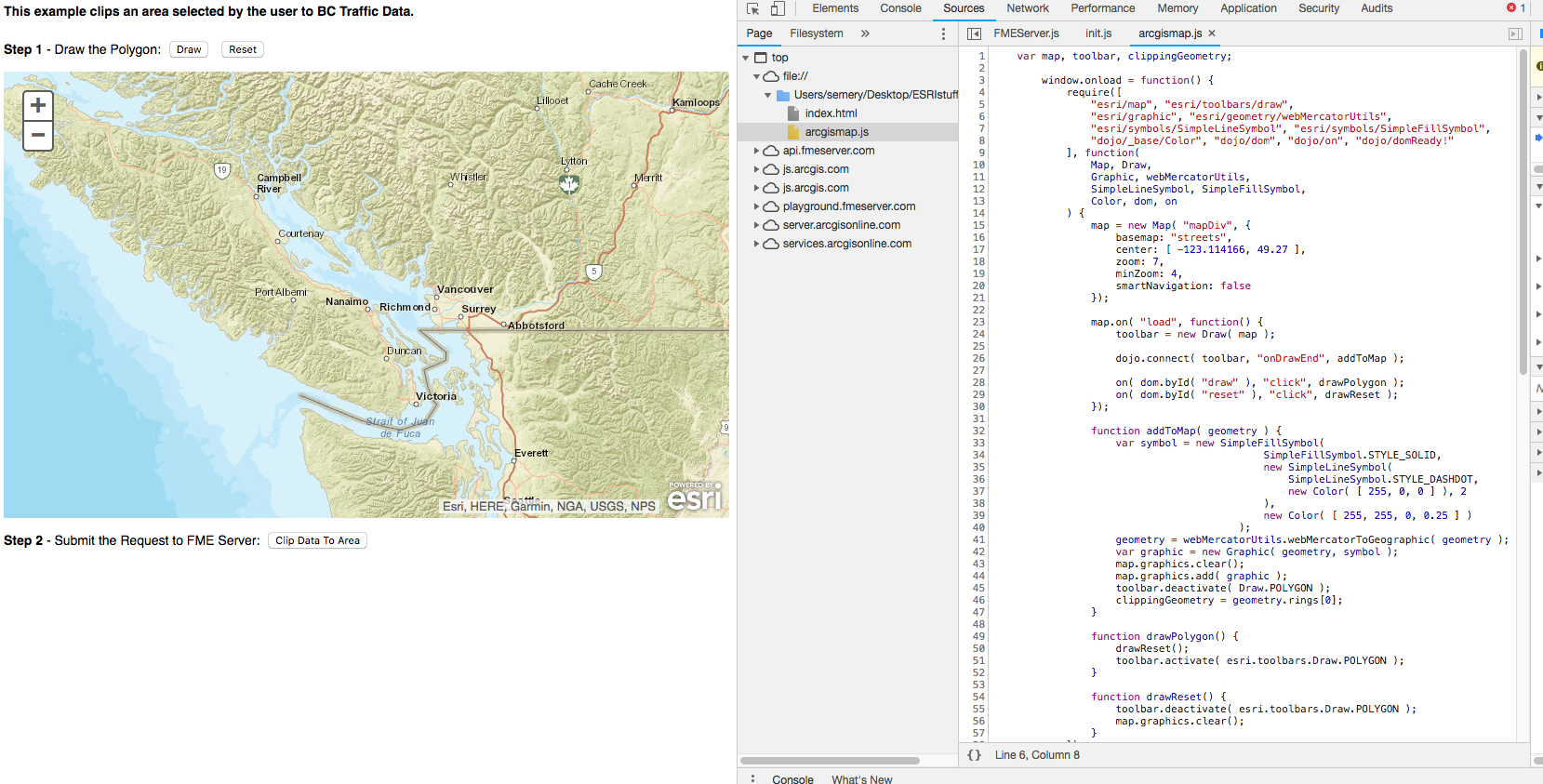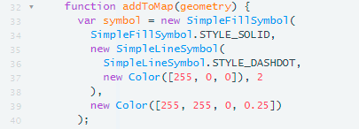 The addToMap(geometry) function (line 32), is from the ArcGIS API JavaScript. This function creates symbols that are added to the map when a user draws an area to clip. As the user selects areas on the basemap, the function will record the coordinates of the areas selected.