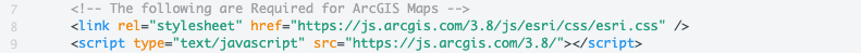 The section of code below (lines 7-9) connects to the Esri CSS. The Esri CSS adds the styling components to the map. Then, the JavaScript links to a JavaScript library made by Esri.