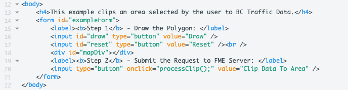 Then, we create a form (line 14-21), with buttons to activate different functions in the JavaScript. The draw button will allow the user to draw on the map. The reset button will reset the users drawing. The third button will use the coordinates selected from the user's drawing and clip the data to the selected area.