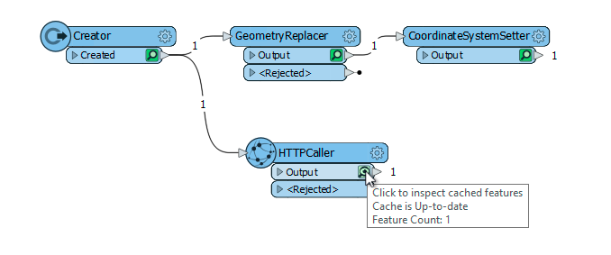 Start typing NoFeaturesTester on the canvas and select the FME Hub Transformer. The NoFeaturesTester should be attached the Inside port of the Clipper. This transformer will test if there was an output or not. If there is no input, this means all the features were outside or rejected.