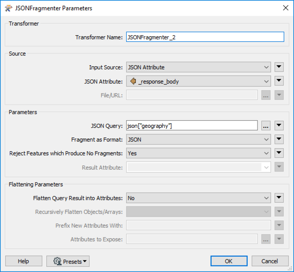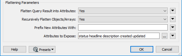 Now, we can flatten the JSON to produce the attributes needed for the table. Set Flatten Query Result in Attributes to Yes.