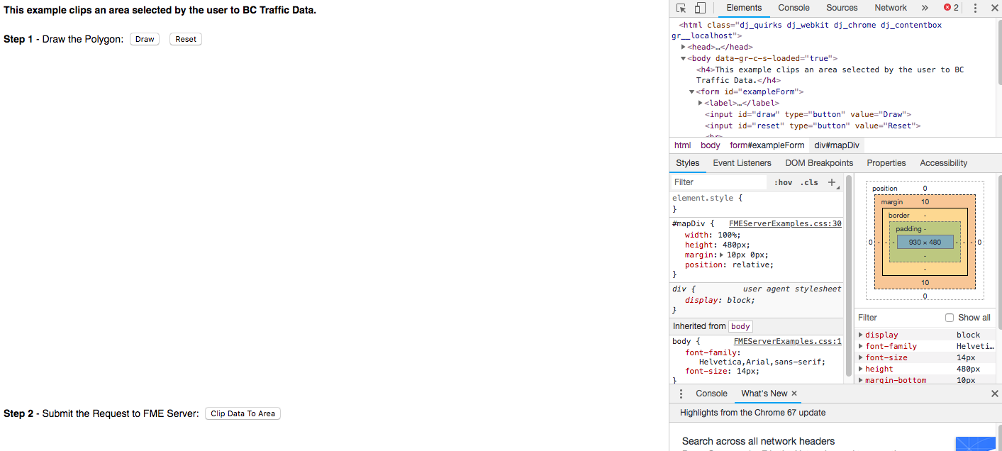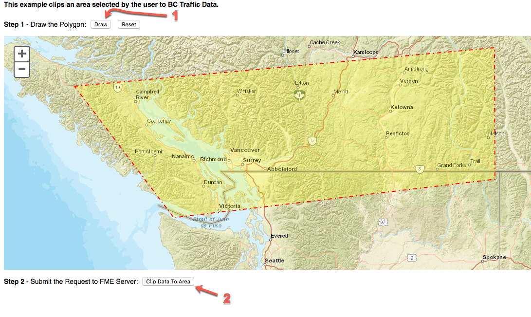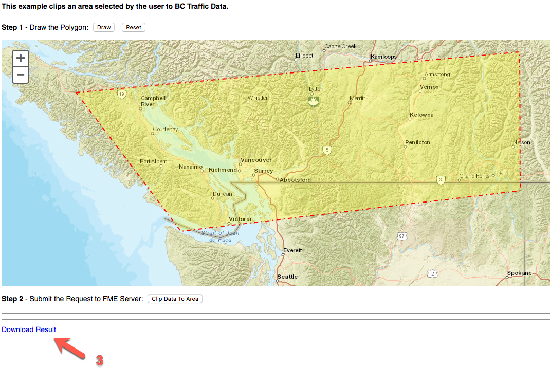 In this exercise, we will be creating a website with a map that allows a user to select an area. This selection will be sent to a workspace. The workspace contains an HTTPCaller which connects to the DriveBC API. The DriveBC API has current data on any traffic incidents that may have occurred. In the workspace, the selected area will clip current accidents. The user will be sent a link with a Google Map with accidents in the selected area. This exercise is meant to demonstrate how to use other APIs in a workspace, how to integrate coordinates selected from a user into a workspace, and how to stream back data to the user.