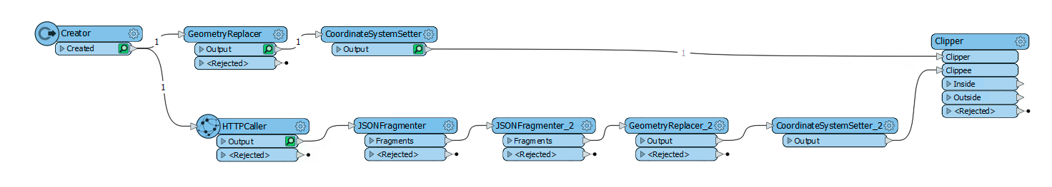 Now, we are going to use the Clipper transformer to clip the area selected area. The Clipper is the area selected by the user, and the Clippee is the geometry from the BC Drive API.