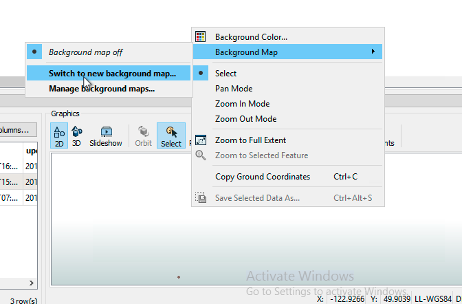 Visual Preview will display the points and lines created. By default the Graphics section will not display the background map. To display the background map, right click on the display area. Select, Background Map, and then select Switch to new background map(...).