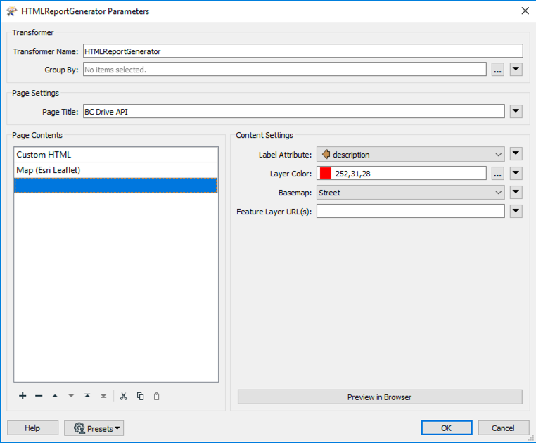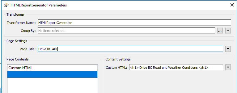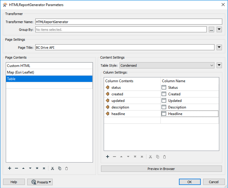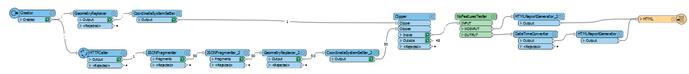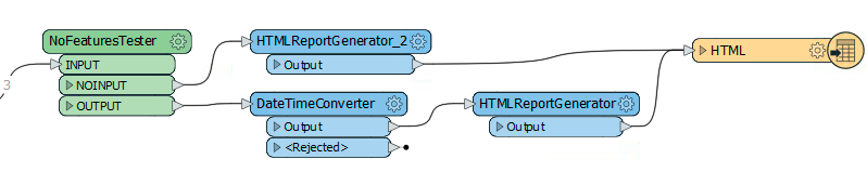 Add the HTMLReportGenerator and attach it to the DateTimeConverter. Now, we are ready to create a webpage with the following information. We need three sections, a title, a map, and a table.