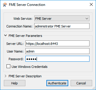 - FME Server URL: https://localhost:8443