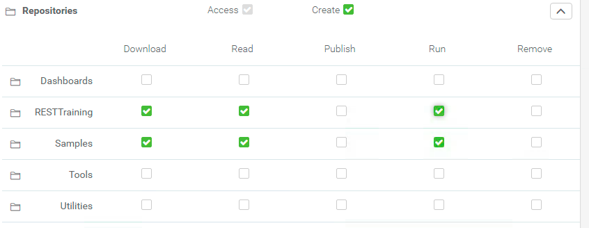 Then, find the Repositories tab and find the RESTTraining repository. From here, we can select the Download, Read, and Run permissions.