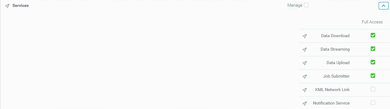 Finally, go to Services. Expand the menu to find the specific Services. Since, we are running a Data Download Service we will have to give the token permissions to access more Services. We will need access to Data Download, Data Streaming, Data Upload, and Job Submitter.