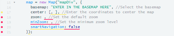 On line 15 we are using the map variable (created on line 1) to create the map object we see on screen. We are going to set four parameters on the map, these include the the basemap type, the coordinates to center the map, the default zoom level, and the minimum zoom.