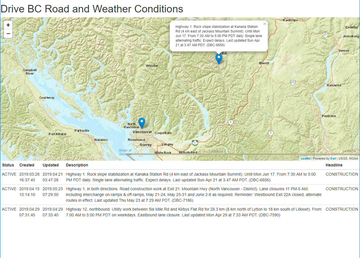 | Demonstrates | Esri Maps Integration, the DriveBC API, Data Streaming, and Data Visualization. |