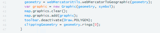 From line 41-46, we are creating a graphic. A graphic is comprised of the geometry and symbol we specified on the previous lines. We then declare the clippingGeometry is the variable which will store the geometry.