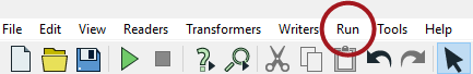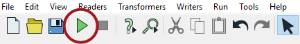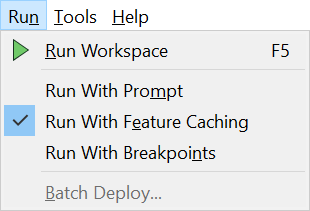 | The action of the Run button can be modified by a series of options including the ability to prompt the user for input (Run with Prompt), the ability to cache intermediate data (Run with Feature Caching) and the ability to run in debug mode (Run with Breakpoints). These are toggle options that can be turned on and off at will. |