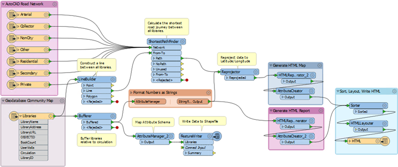 | This small demonstration illustrates the power of FME. This workspace read data from multiple spatial datasets and wrote it out to datasets in both spatial and "tabular" formats. In between it carried out a series of transformations and spatial analyses, buffering and reprojecting the data, and creating added value and information. |
