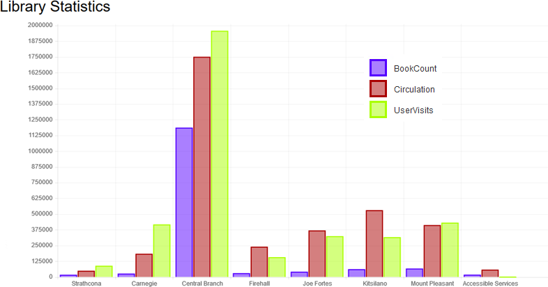 Open a web browser such as Firefox or Chrome. Open the output file created by FME (usually Ctrl+O or File > Open is the easiest way). You will see a table of libraries, a graph of library statistics, and an interactive map showing where the libraries are located. All this has been generated by FME from the incoming Geodatabase points and attributes:
