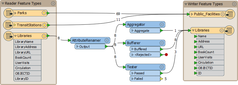 Here FME reads 8 features but, because there are multiple connections, creates multiple copies of the data.