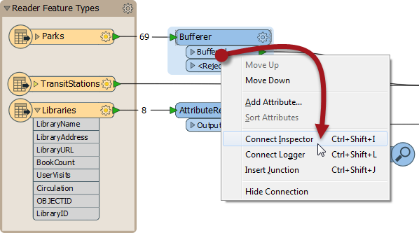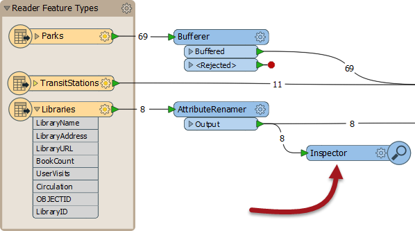 An Inspector is a Workbench transformer with a distinctive look and style that causes data entering it to be directed to FME Data Inspector, even mid-translation.