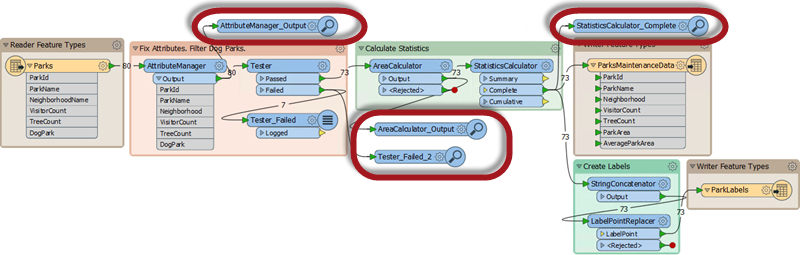 To assist in inspecting data, Workbench can route data to the FME Data Inspector from individual transformers.