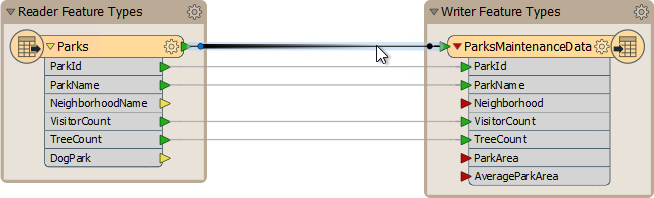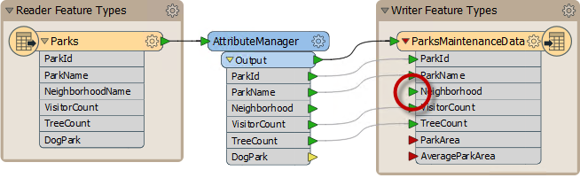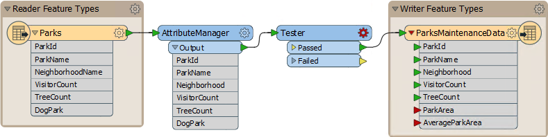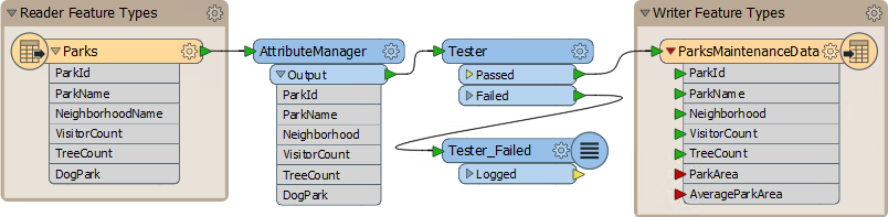 We can do this with a Tester transformer. Click on the connection from the AttributeManager output port to the ParksMaintenanceData feature type on the Writer.