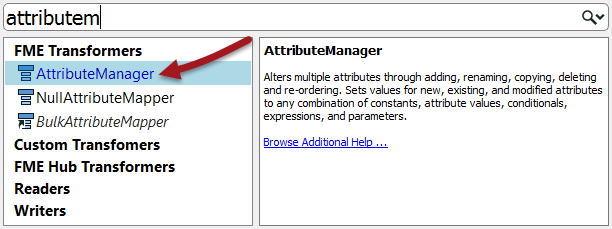 Start to type the phrase "AttributeManager." This method is how we can place a transformer in the workspace. As you type, FME searches for a matching transformer. When the list is short enough for you to see the AttributeManager, select it from the dialog (double-click on it):