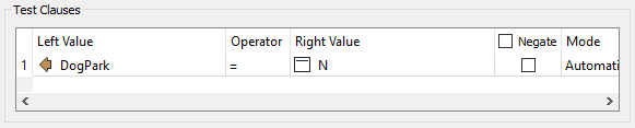 Inspect the parameters for the Tester transformer. Click in the Left Value field and from there click the down arrow and choose Attribute Value > DogPark:
