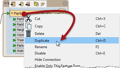 Because we want to write label features to a separate layer (table) in the output, we need to create another feature type object on the canvas. There is more about this in a later chapter, but for now, right-click the writer feature type and choose the option Duplicate. Doing so creates a new feature type (layer) in the output dataset.