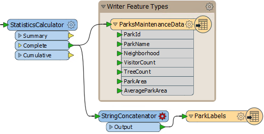 Connect it to the Complete port of the StatisticsCalculator by dragging a second connection from there to the new transformer.