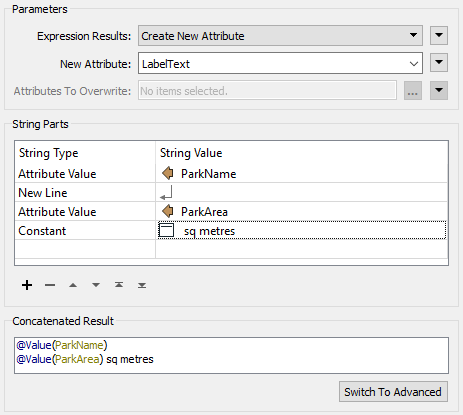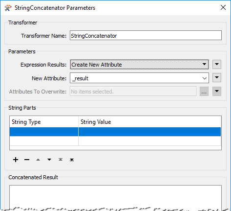 View the parameters for the StringConcatenator transformer. There are both basic and advanced dialogs, and the basic one looks like this: