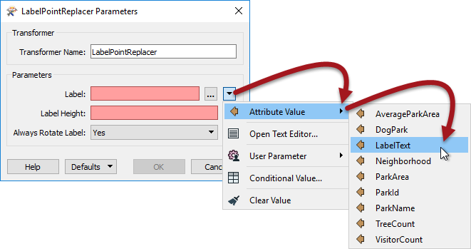 Many parameter fields (like Label Height) can be set either as a constant value (by typing it in) or set to an attribute by clicking the drop down arrow and selecting Attribute Value.