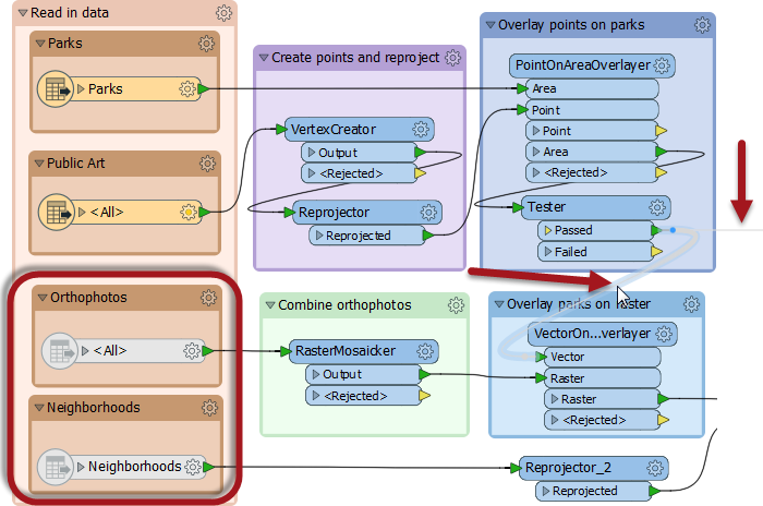 With that setup the top part of the workspace will operate up until (and including) the Tester. The bottom portion will not run at all. No data will emerge from the disabled feature types, and no data is passed to it from the Tester.