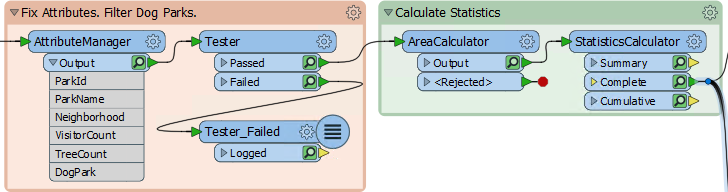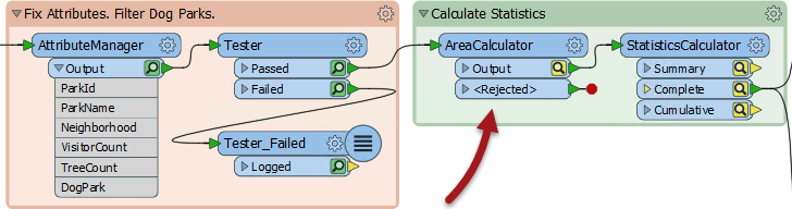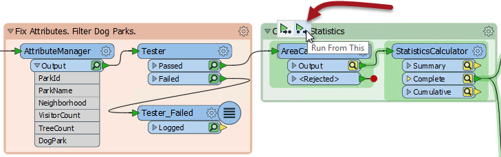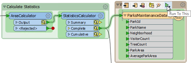 Notice that the caches change color (to yellow) on the AreaCalculator and subsequent transformers. This color denotes that caches are stale; their data contents no longer match what the workspace would produce.
