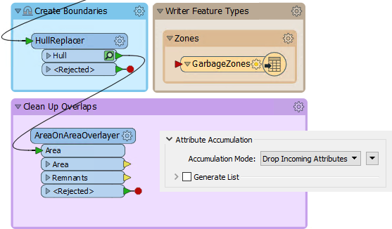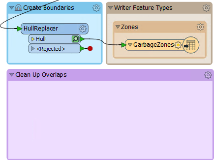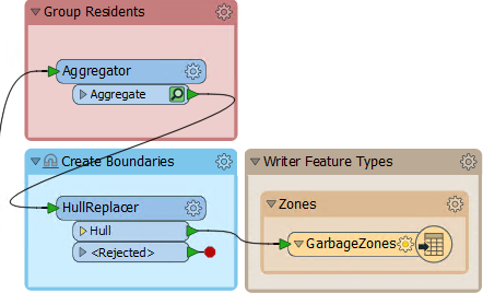 Move the HullReplacer transformer from the "Transformers" bookmark into the "Create Boundaries" bookmark. Connect it between the Aggregator and writer feature type: