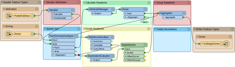 We now have five polygon features to represent garbage collection areas, each with approximately the same number of residents. Connect the Dissolver:Area port to the writer feature type and this workspace is complete... nearly.