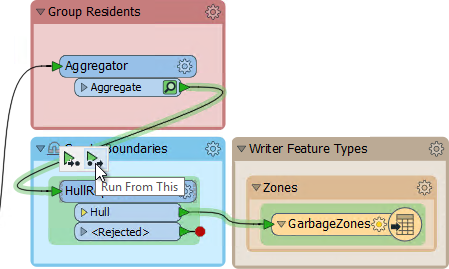 Now let's re-run the workspace. But rather than run the whole translation, click on the HullReplacer transformer and on the icons that pop up, click Run from This: