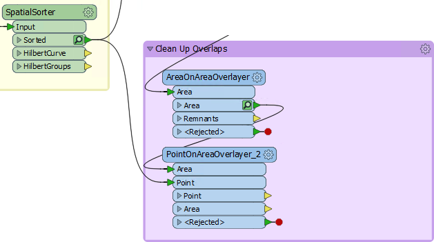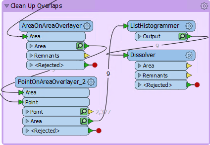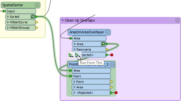 Confirm this works correctly by running the workspace at the new PointOnAreaOverlayer. Notice how the translation pulls data from two caches; the AreaOnAreaOverlayer and SpatialSorter transformers: