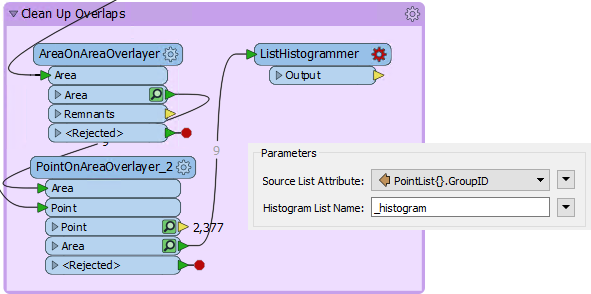Place a ListHistogrammer transformer connected to the PointOnAreaOverlayer:Area output port. Inspect the parameters and select PointList{}.GroupID as the source attribute: