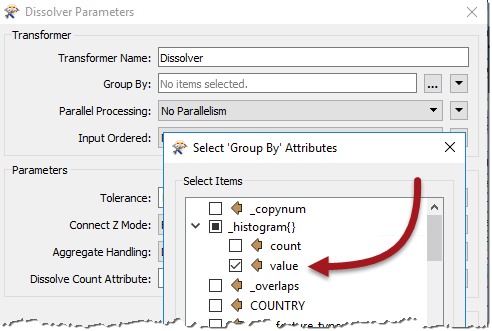 Finally add a Dissolver transformer to merge the features together. Connect the Dissolver to the ListHistogrammer output port: