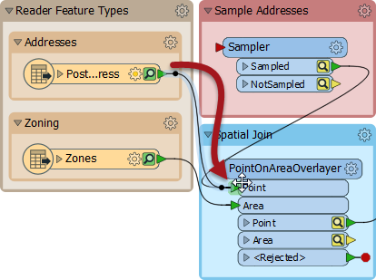 To complete the project let's run the workspace on the full dataset. You can do this by deleting the Sampler transformer (the simplest solution) or by replacing the PostalAddress-Sampler connection with a PostalAddress-PointOnAreaOverlayer connection: