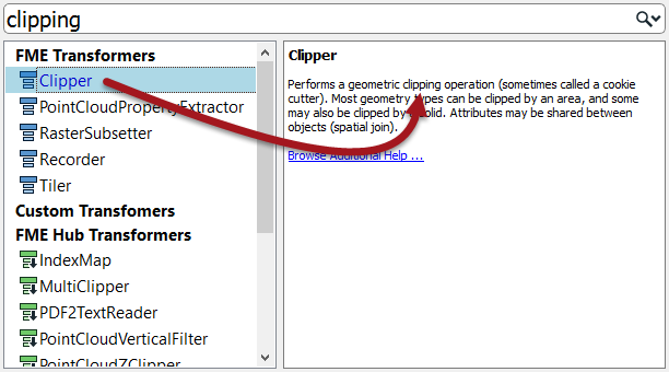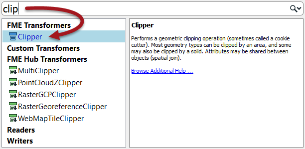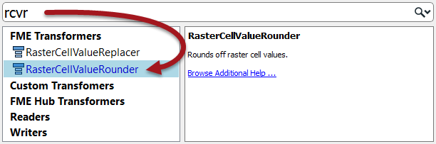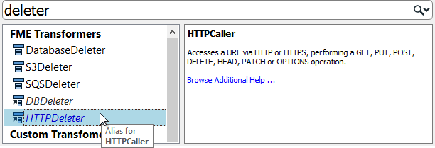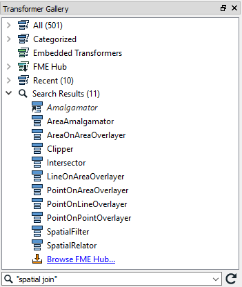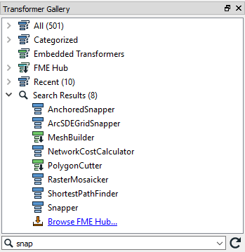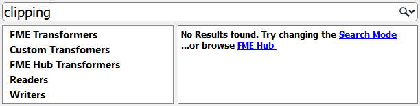 Quick Add results include aliases - for example, transformers that have an alternative name or which have been renamed - and also include transformers found in the FME Hub: