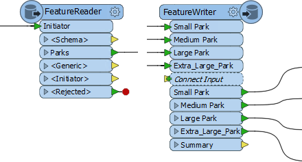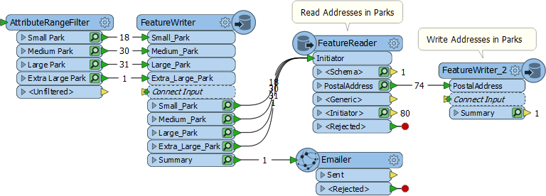 Notice also that an important part of the FeatureWriter is that its exit ports can be connected to other transformers for further processing. In the above screenshot parks data is written, and a single summary feature used to trigger an Emailer transformer. The Emailer sends a copy of the data to a user.