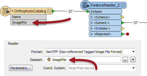 This example includes both reader and FeatureReader. The workspace reads a Shapefile dataset containing an index of orthophoto datasets. Each feature in the Shapefile is a polygon representing the orthophoto boundary with an attribute that points to a GeoTIFF file containing that orthophoto.