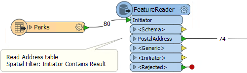 A dataset of parks supplies input features that trigger reading from a database address table. A spatial filter is applied so that the only addresses to emerge are ones that fall inside a park.
