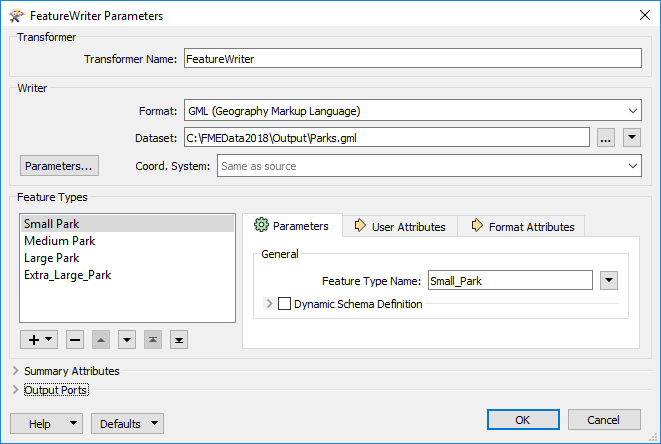 The dialog allows the definition of the format and dataset to write, plus the feature types that are to be written and their attributes. In short, all of the parameters, settings, and schema definition required for a writer, appear in this single dialog.