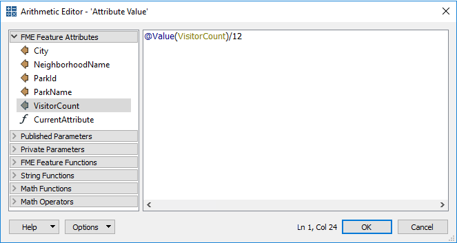Here the user is calculating the monthly number of visitors to a park by dividing the annual number of visitors by 12 (twelve). As with the text editor, existing attributes and arithmetic functions were obtained from the menu on the left-hand side.
