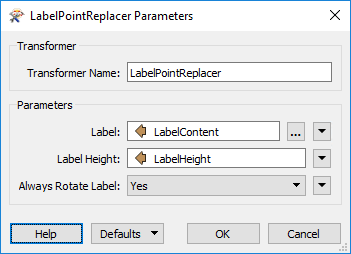 As noted, most transformer parameters allow the user to select an attribute value instead of manually entering a fixed value. For example, the LabelPointReplacer can create a label whose contents and height are specified by attribute values: