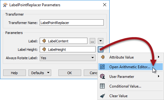 | It's a fixed rule that the editor dialogs available depend upon the type of parameter being set. For instance, the Label parameter in a LabelPointReplacer opens a text editor because the parameter requires a text value. The Label Height parameter opens an arithmetic editor because that parameter requires a numeric value. |