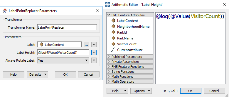 The calculator allows the selection and use of FME attributes, other parameters, plus mathematical and string-based functions. For example, here the user has chosen to calculate the height of their labels using the logarithm of the visitor count for a park: