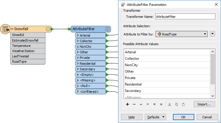 If you were using seven Tester transformers to separate this data, you could save space on the workspace canvas and replace that setup with just a single AttributeFilter.