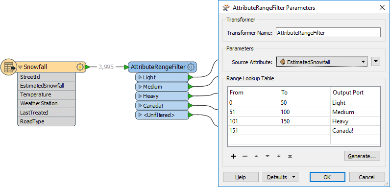 Notice that the AttributeRangeFilter parameters dialog has a Generate button to generate ranges automatically from a set of user-defined extents.