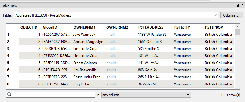 The table that is to be translated is called "PostalAddress." The important thing here is not how the data looks in the graphic display, but more what attributes exist in the Table View window.