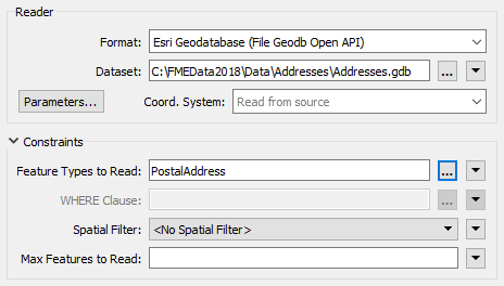 | Reader Dataset | C:\FMEData2018\Data\Addresses\Addresses.gdb |